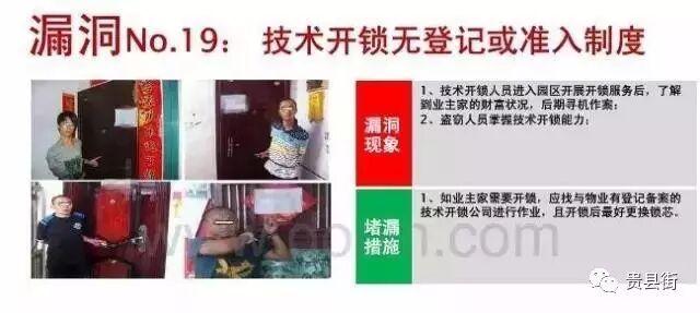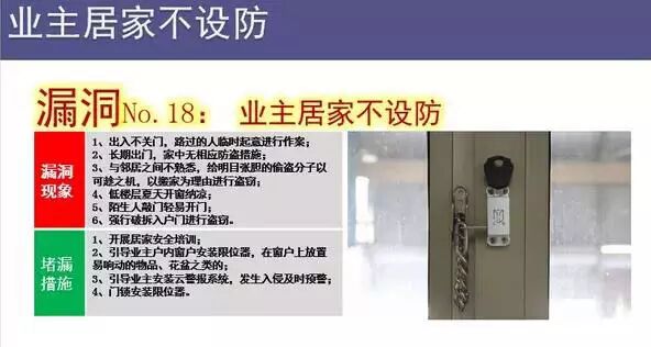 良好的小区治安秩序是靠全体业主的共同支持才能完成的,让我们携手打造一个安全的社区,物业服务中心提醒所有业主注意以下几点: 1. 为了防止闲杂人员进入楼道,请你进出时关好单元门,不要将门禁卡交于无关人员;遗失了门禁卡,请及时至服务中心挂失、补办。 2. 对外来上门人员必须提高警惕,如发现有陌生人员按门铃或小区内有可疑人员,敬请及时告知服务中心或与监控中心联系。 3. 晚上休息或外出时,请一定认真查看门窗是否关闭并锁好,做好自我防范措施。 4. 外出旅游时,请切断室内电源,关闭水阀、气阀,同时尽量不要在家中存放大量的现金及贵重的首饰和物品。 5. 停车场停放的车辆,要关闭好车窗,车上不要存放贵重物品;并且请勿占用消防通道,确保消防通道的畅通。更多精彩关注物业社区微信。 6. 邻里之间和睦相处、相互关照。不要高空抛物,以免伤害他人,文明施工;装修施工结束的业主,请及时更换B钥匙,并及时到物业服务中心办理装修验收手续及办理施工人员出入证退证手续,以免发生被盗现象。 7. 如已装修完工且不经常入住的业主在外出时,请及时至物业服务中心进行备案,服务中心将会关闭水阀,并加大对您房屋的巡视、检查力度。 8.如您家有装修工人或亲友来访,请他们配合秩序维护队员做好查询与登记工作。