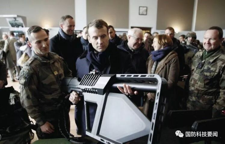 ▲法国总统埃马纽埃尔·马克龙在访问法国陆军基地期间手持“无人机战术干扰枪”