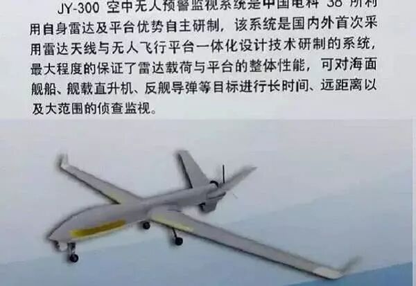 天哨无人机实现雷达与无人机一体化设计也表明它应该是38所在2016年珠海航展上面展出的JY300无人预警机,根据38所在珠海航展公开的资料,JY300中高空长航时无人飞行器,配备了有源相控阵预警雷达和光电吊舱,可以长时间在舰艇编队上空飞行和警戒,扩展编队低空视野,能够更好的抗击超低空掠海反舰导弹、水面舰艇和直升机探测,提高了水面舰艇编队防空、反舰作战能力。