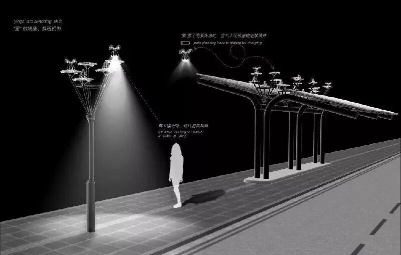 每个单独的路灯由一根杆子和多个Twinkle无人机组成。无人机配载LED照明灯,可以照亮其下的空间。当它们停留在灯柱上时,看起来就像普通的路灯。然而,一旦行人从路灯下面经过,一架Twinkle无人机就会离开它的停留地点,并跟随周围的行人,为他们照明。这种灵活的照明解决方案在行人经过黑暗的小巷等路灯盲点时很有用处。如果Twinkle的电池快用完时,则会返回附近的充电底座并在途中派送另一个Twinkle。