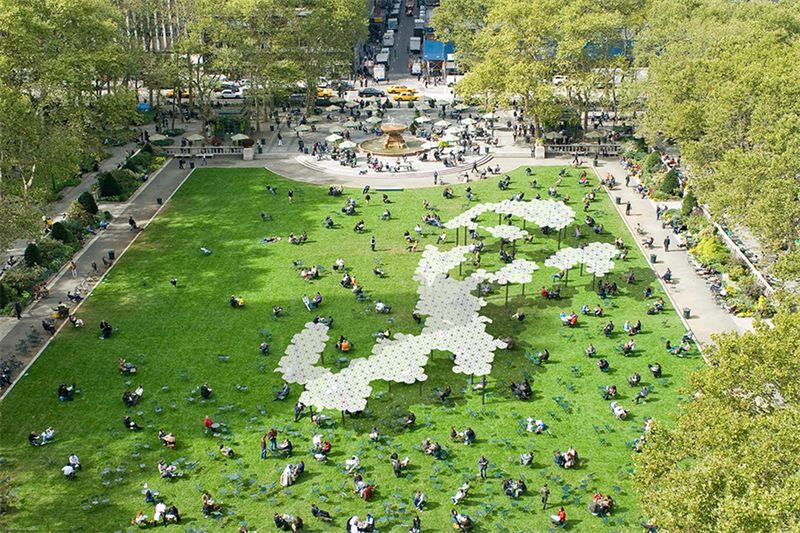 遮阳棚的遮阳部分由碳纤维模块制成,并与传感器和通信设备集成在一起。无人机通过编程指令,与每个模块进行通信,就像携带花粉的昆虫一样抓住模块,并将它们挂钩到位。