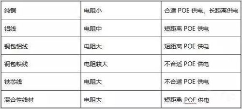 市面的非标准网线材质主要有铜包钢、铜包铝、铜包铁等,这些网线的阻值大,都不适合用来POE供电。POE IEEE 802.3af标准要求PSE输出端口的输出功率为15.4W或者15.5W, 传输100米后的PD设备接受功率必须不小于12.95W。